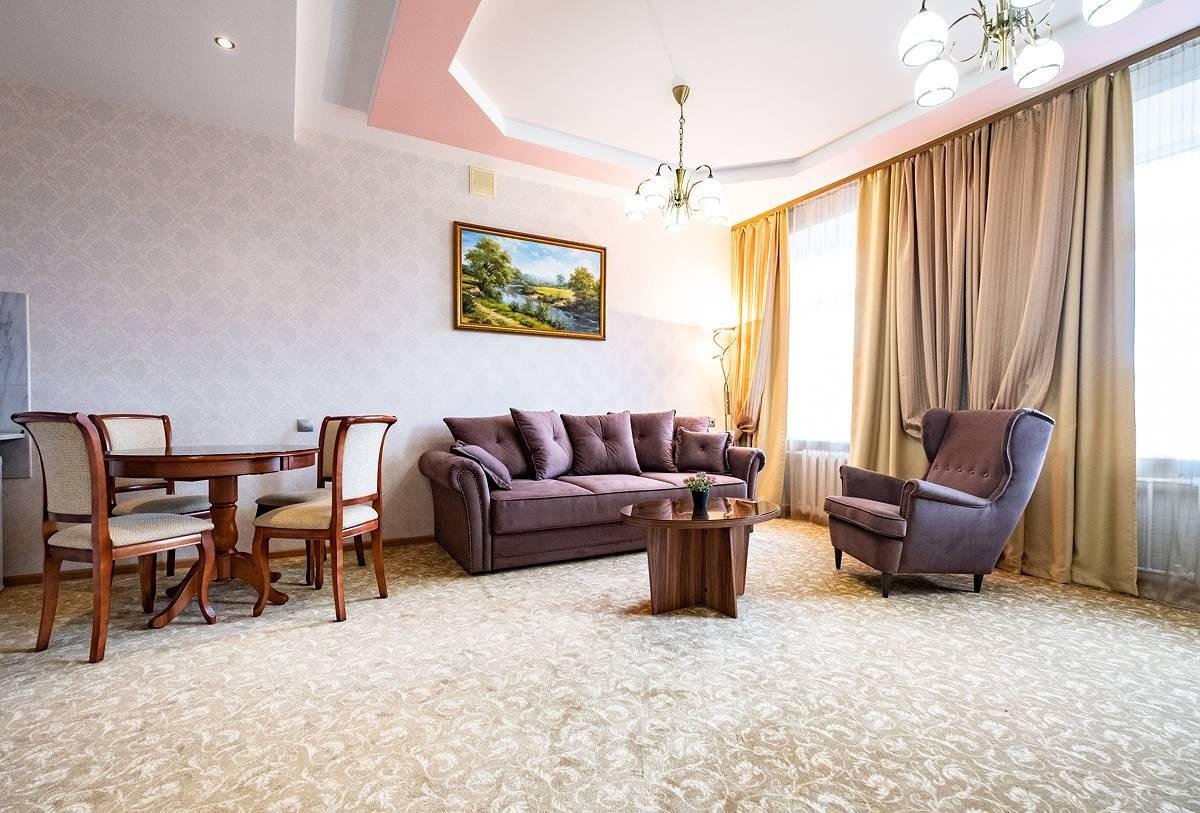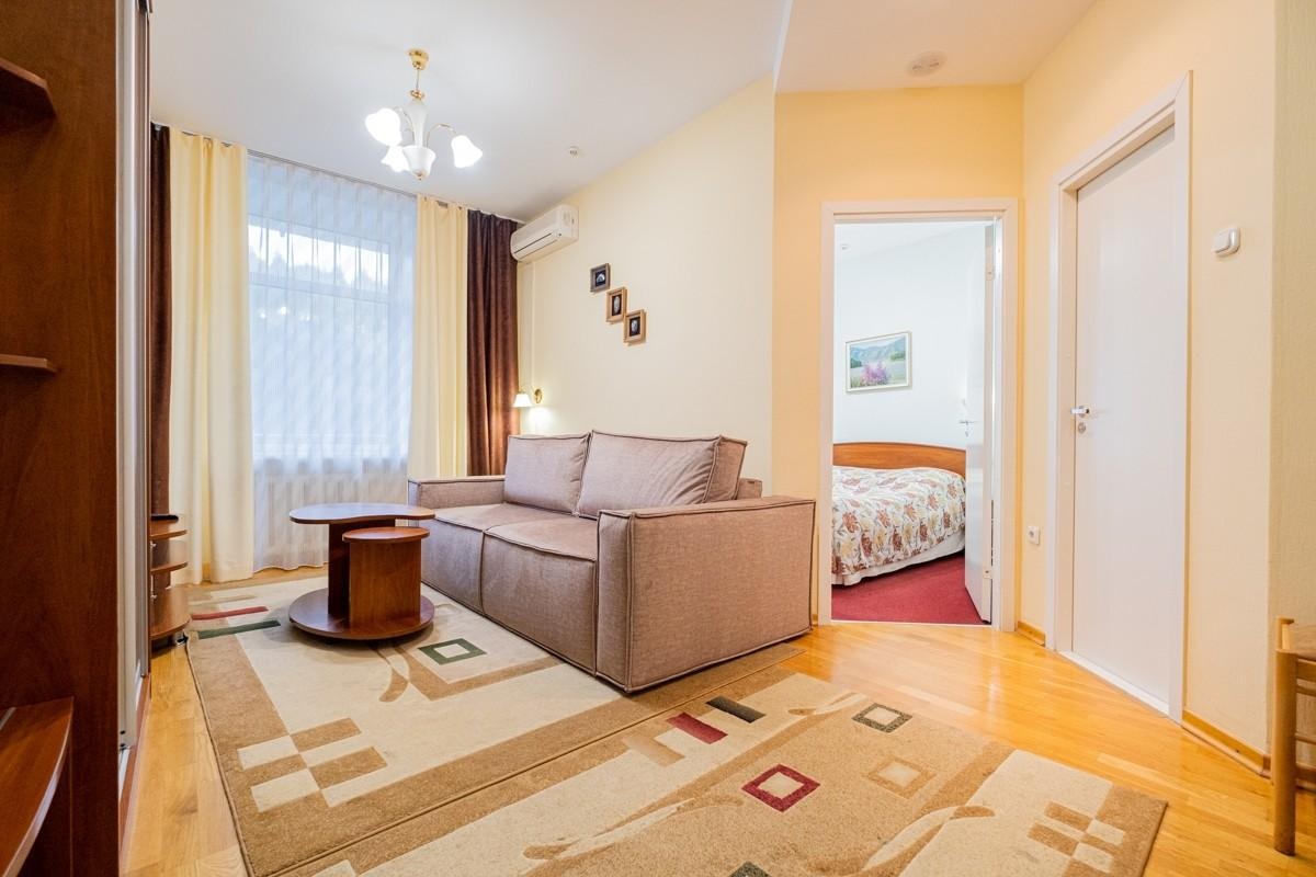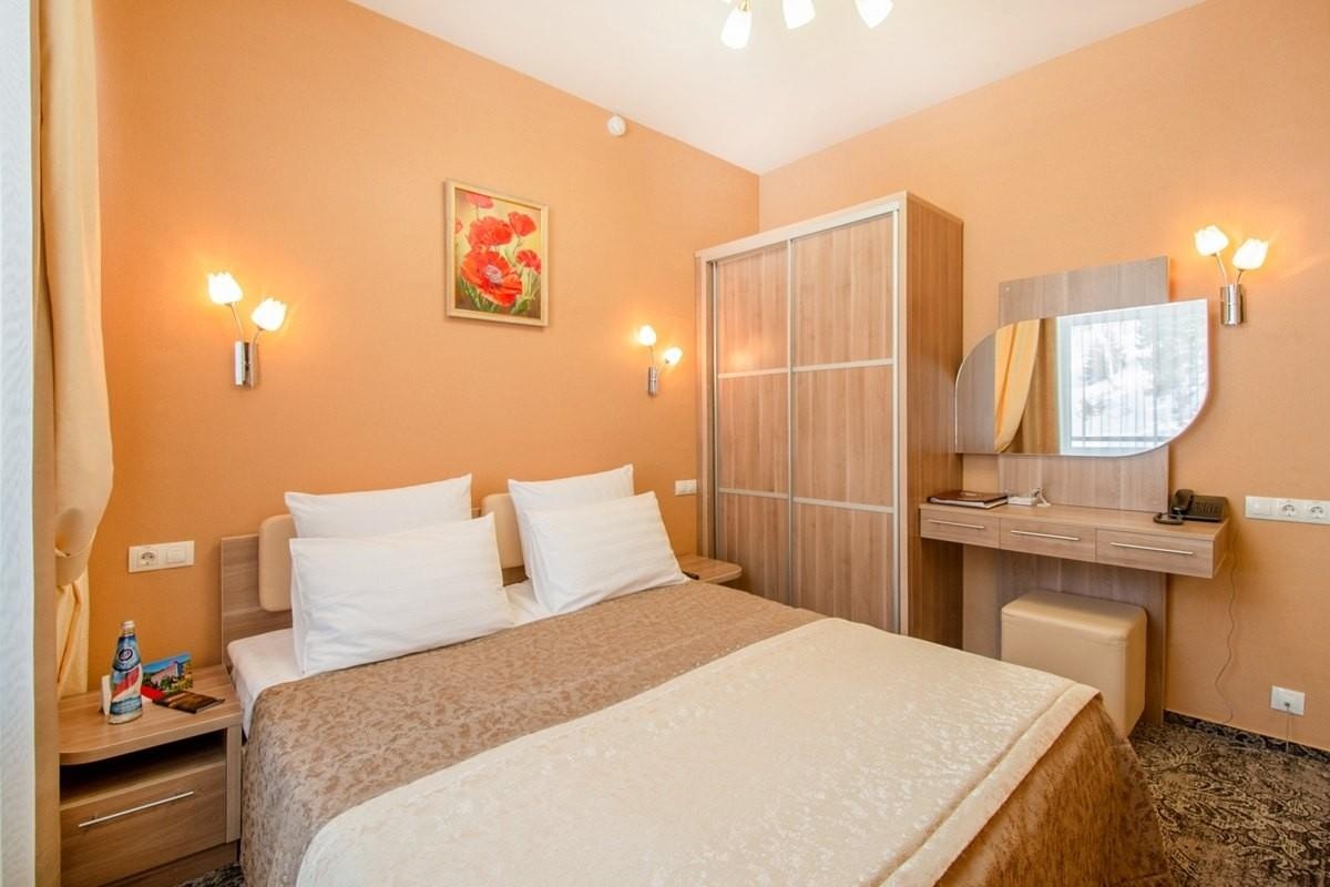 Просторный двухкомнатный номер, разделен на светлую гостиную и уютную спальню. Интерьер создан для комфортного размещения четырех человек. Номер располагает двуспальной кроватью с ортопедическим матрасом (160-180см) и диваном–кроватью. Здесь есть балкон с видом на лес и горы, оснащенный кофейным столиком и стульями.