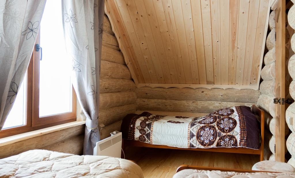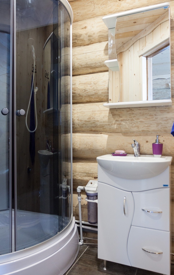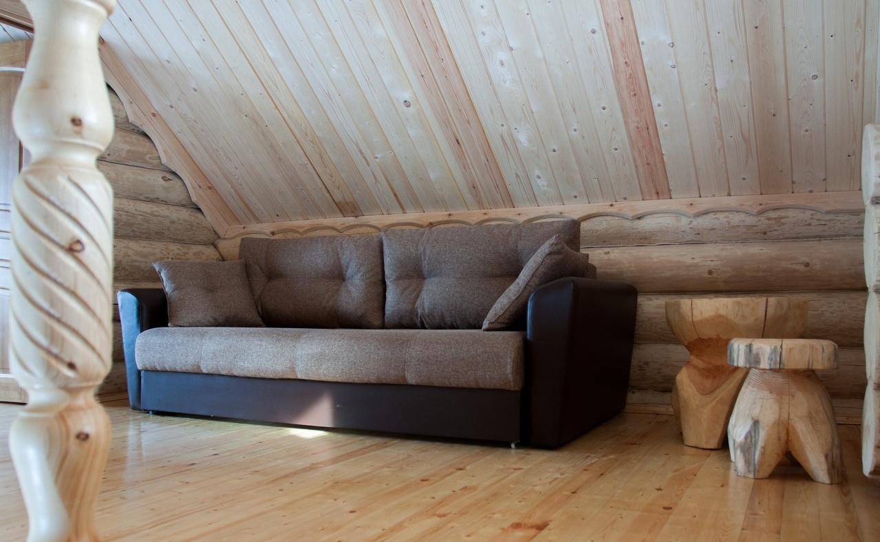 - Благоустроенный гостевой дом из карельской сосны на 5-7 человек: имеет два этажа, две спальные комнаты и гостиную;