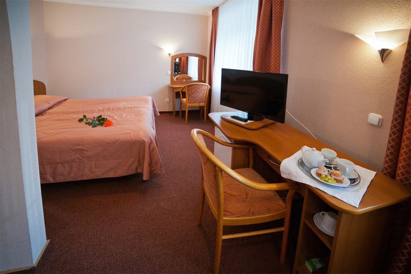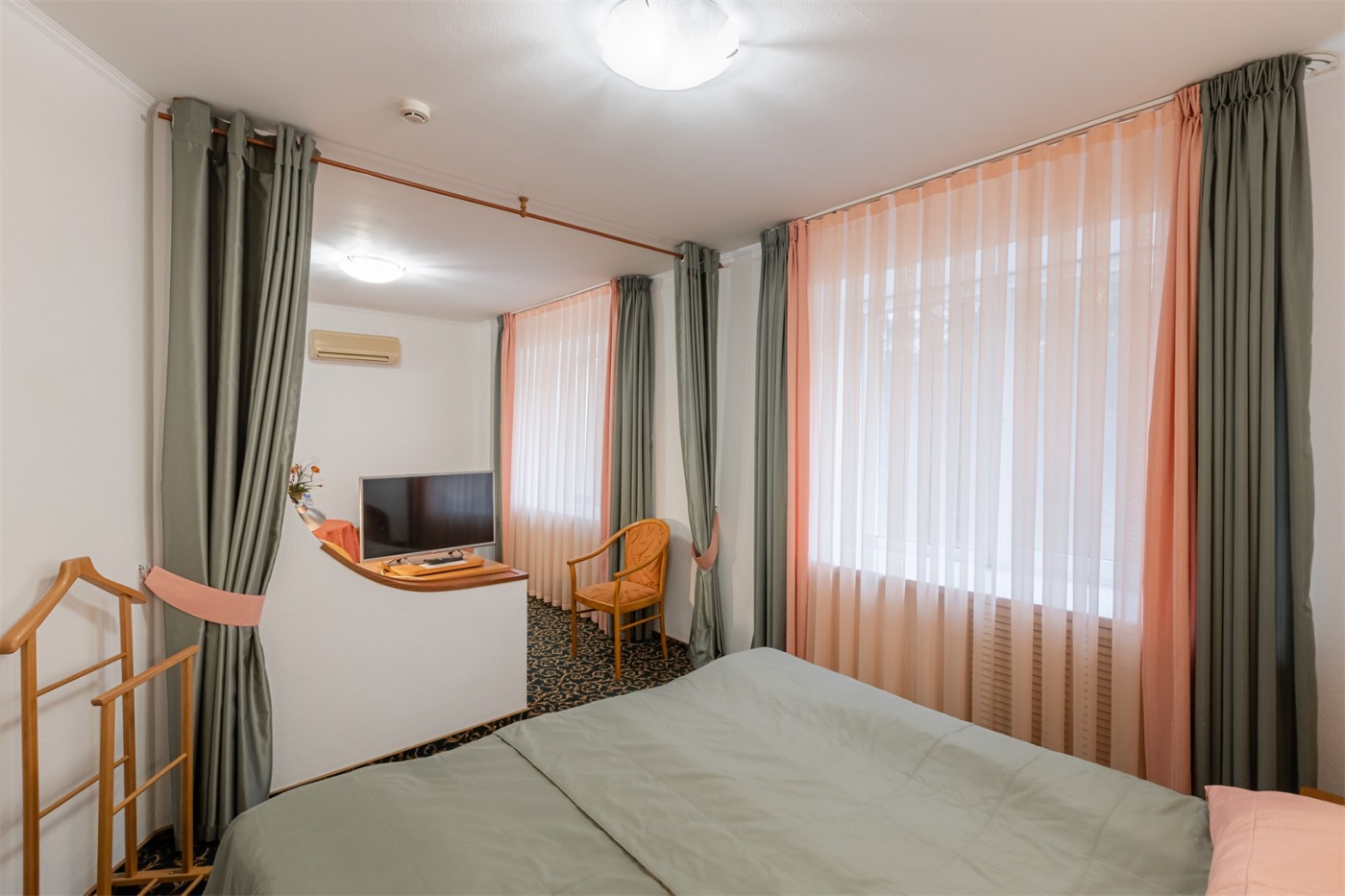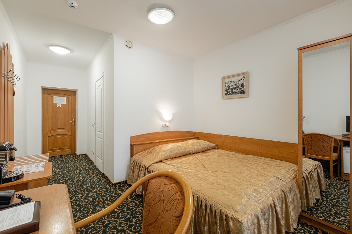 Уютный однокомнатный 2-местный номер без балкона. Оснащён двумя односпальными или большой двуспальной кроватью. Оборудован сплит-системой, холодильником и телевизором. В номере имеется санузел с ванной. В наличии комплект банных полотенец, косметические средства и фен.