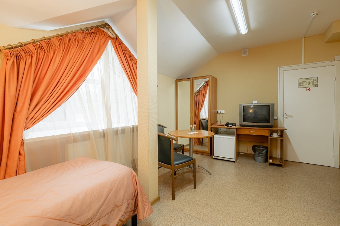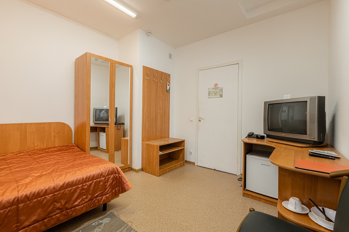 Уютный однокомнатный 1-местный бюджетный номер. Оснащён одной односпальной кроватью. Оборудован холодильником и телевизором. Ванная комната и санузлы на этаже.