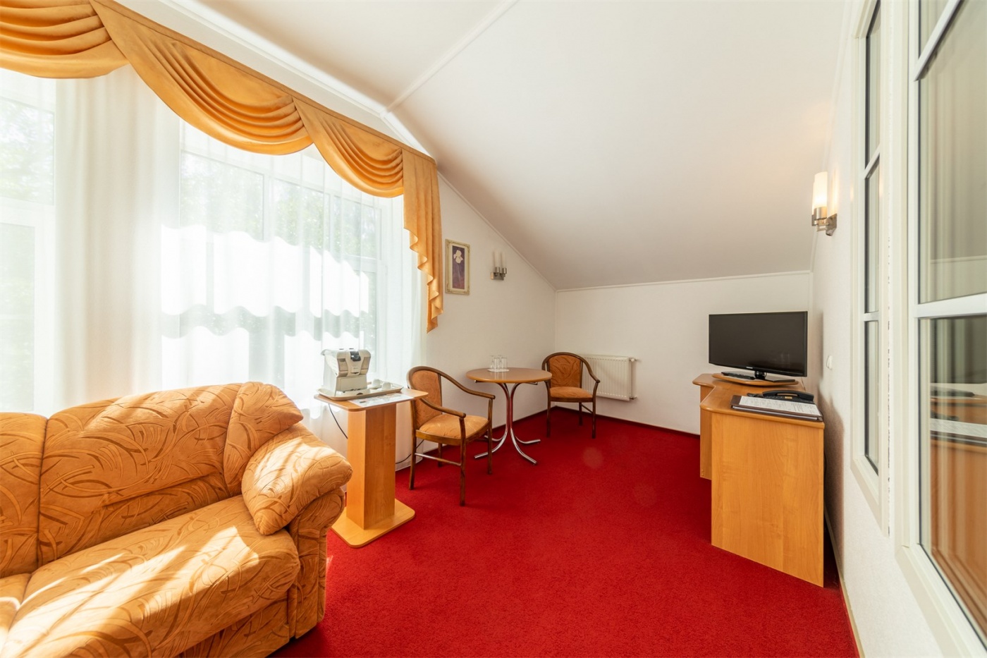 Уютный двухкомнатный 2-местный номер на 4 (мансардном) этаже. Разделён на спальню и гостиную. Оснащён одной большой двуспальной кроватью «Queen size» и раскладным диваном. Оборудован сплит-системой, холодильником и телевизором. В номере имеется санузел с душем. В наличии комплект банных полотенец, косметические средства и фен.