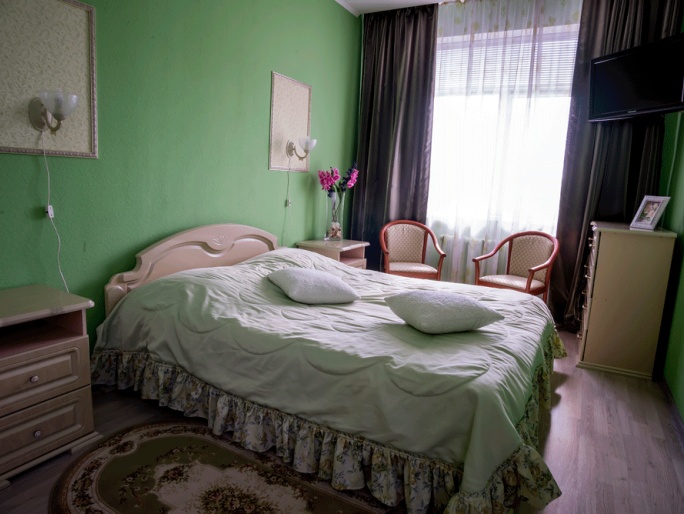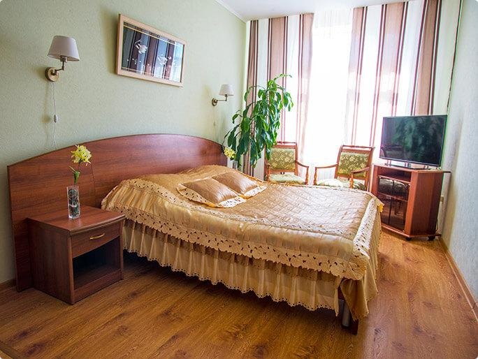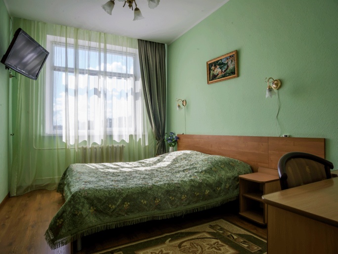 Просторный однокомнатный номер повышенной комфортности, оборудованный двуспальной кроватью, необходимой мебелью и бытовой техникой. В номере собственный санузел с ванной.