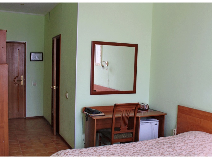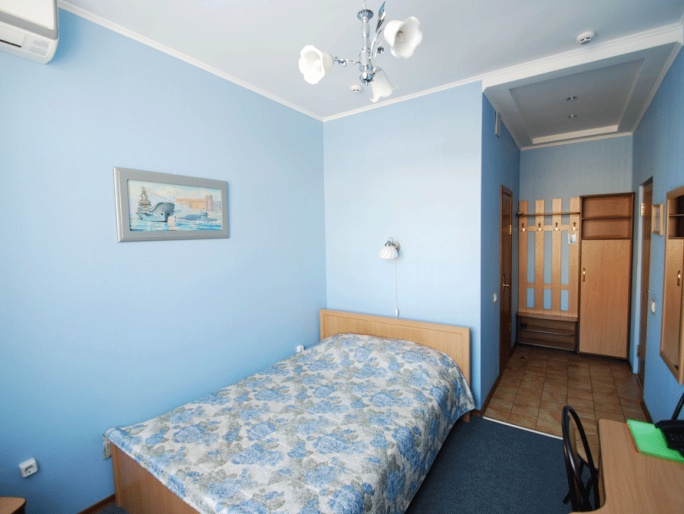 Небольшой однокомнатный номер для одного гостя, оборудованный полутороспальной кроватью, необходимой мебелью и бытовой техникой. В номере собственный санузел с ванной.