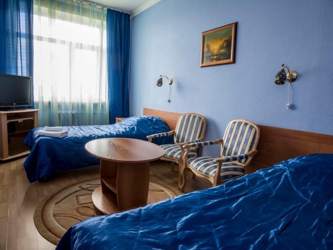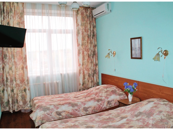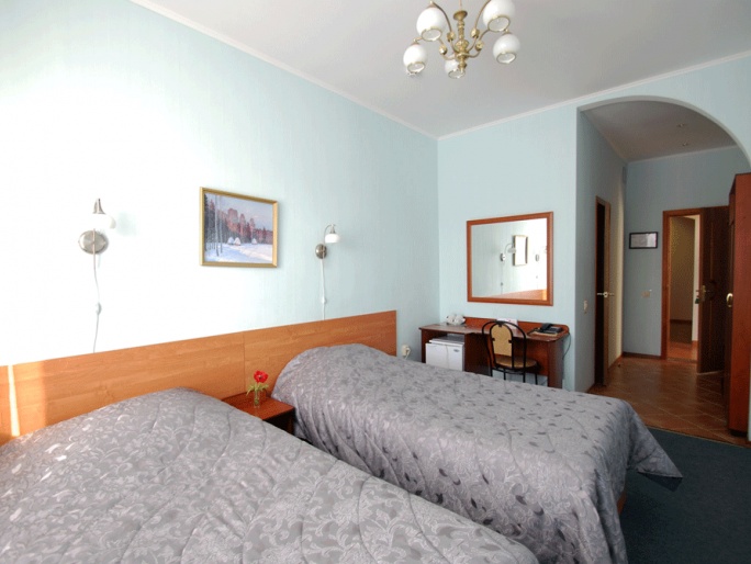 Небольшой однокомнатный номер для двоих, оборудованный двумя кроватями, необходимой мебелью и бытовой техникой. В номере собственный санузел с ванной или душем.